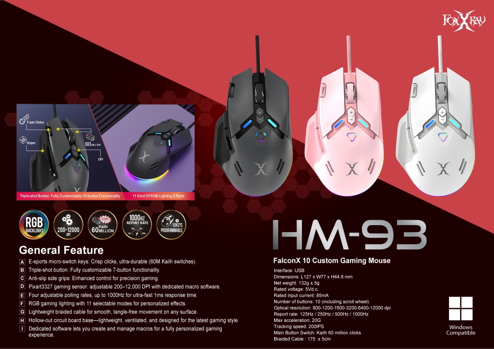 ▶Pixart3327 gaming sensor: adjustable 200-12,000 DPI with dedicated macro software.