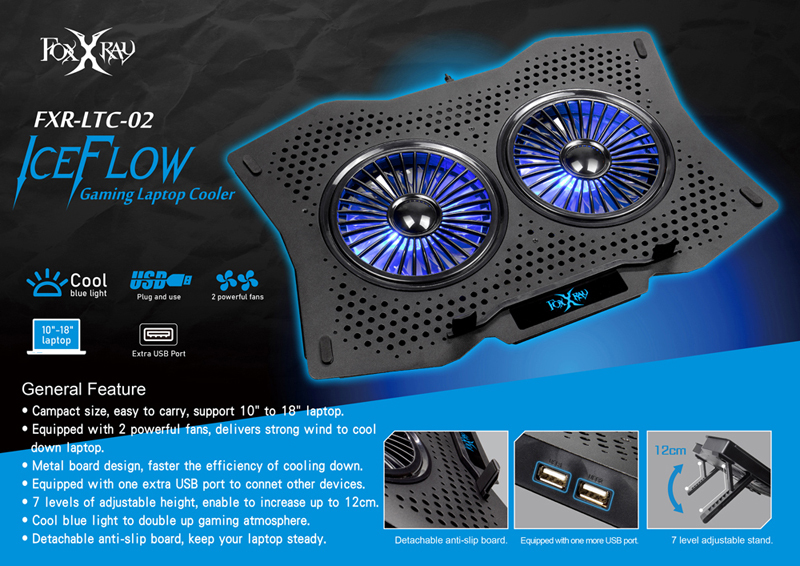 Equipped with 2 powerful fans, delivers strong wind to cool down laptop.